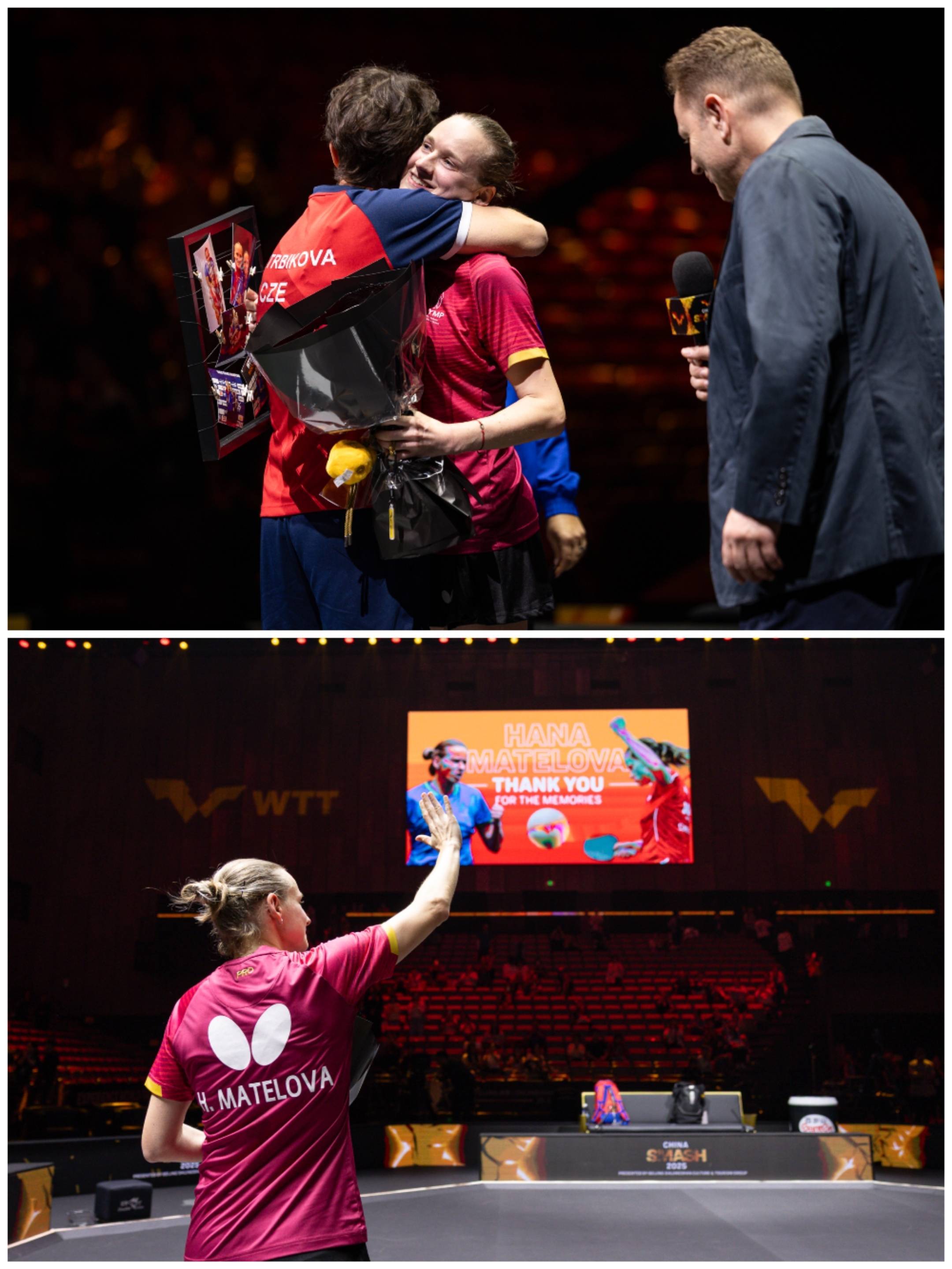 来北京前,马特洛娃曾自大会在本次中国大满贯赛扫尾后退役。本认为这会是一场无东谈主问津的告别,没料想WTT为她尽心准备了典礼,现场不仅有鲜花、掌声和订制礼物,还有从远谈而来,见证她退役的双打搭档巴拉佐娃。