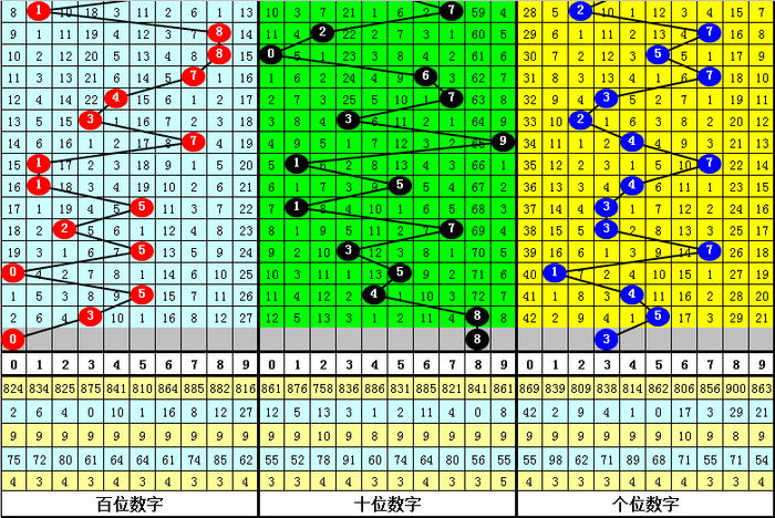 百位分析:该位最近10期开出了3个0路号码、3个1路号码、4个2路号码,2路号码热出。本期排斥1路号码,参考号码:0。